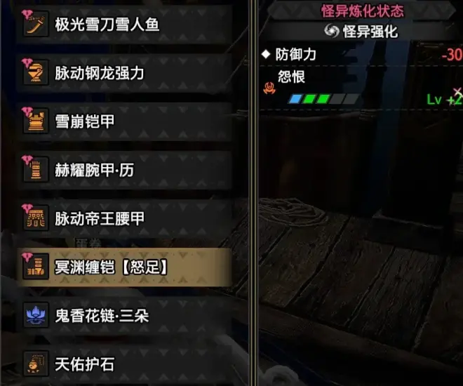 怪异槽扩充Lv6(攻击力+15、属性+18、锋利度+10)+攻击力强化Lv1(攻击力+5)+属性强化Lv7(属性+27)