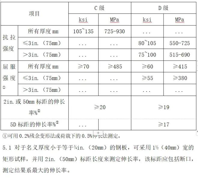 1.3 钢板的最大厚度仅受化学成分满足规程力学性能要求能力的限制。但现在通常将级别C的最大厚度限制为0.58in.(15mm),级别D的最大厚度限制为6in.(150mm)。