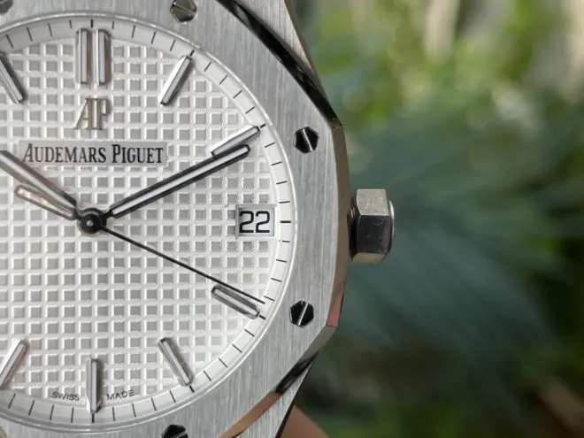 圈口:八边形表圈上侧面则是采用抛光工艺,呈现出两种不同的金属质感,表圈上镶嵌的8枚六角形螺丝体现了皇家橡树系列最为传奇的美学设计。