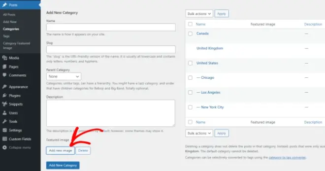 插件激活后,您可以从WordPress仪表板转到帖子»类别。现在,在添加新类别或子类别时,您会看到一个新的“精选图片”选项。