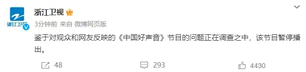 浙江卫视暂停了《好声音》的播出,具体问题还在调查中。