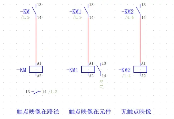 图中线圈旁显示的触点叫做触点映像,触点映像是一个特殊的关联参考显示形式,显示了所有的设备触点,已放置和未放置的功能。触点映像仅仅是触点的索引,图中触点映像显示在线圈下方的方式,被称为“在路径”上;触点映像显示在线圈右方的方式,被称为“在元件”上;触点印象不显示,只在线圈旁显示关联参考,则是定义无触点印象。触点映像的显示选择在主功能元件属性—显示标签下修改。