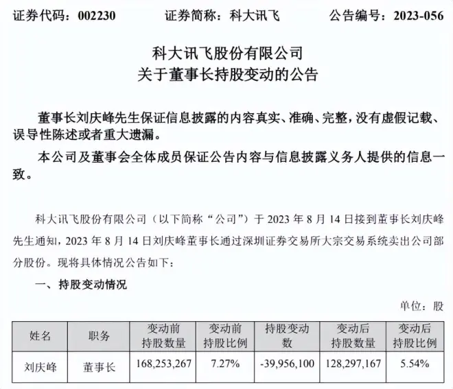 8月14日,科大讯飞发布公告,公司董事长刘庆峰通过大宗交易系统卖出公司1.73%股份。此次减持后,刘庆峰对科大讯飞持股数量从1.68亿股降至1.28亿股,持股比例由7.27%缩减至5.54%。