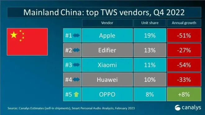 蓝牙资讯|2022 年 Q4 全球 TWS 耳机出货量 7900 万部