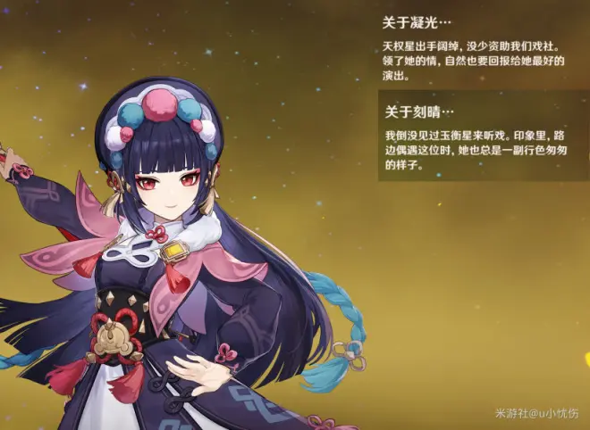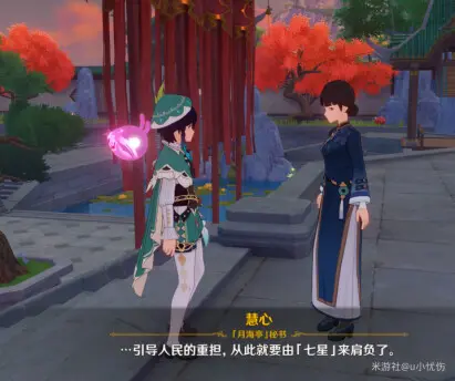 慧心:七星直属机构[月海亭]秘书,天叔的女儿,具体故事可在甘雨传说任务中可见。