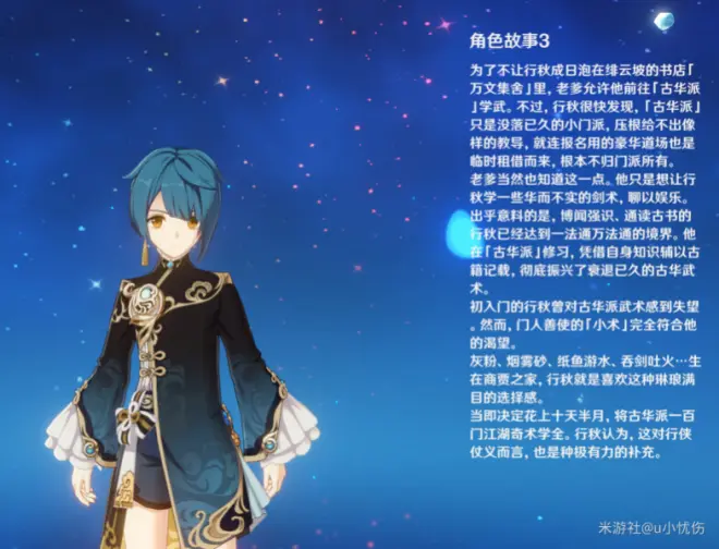 作为家族次子,商会事务尚不需要行秋主持。但在各大巨贾子弟中,行秋拥有罕见的读书天赋,向来受教书先生们赞赏。可以用巨贾来形容也说明了行秋家的商业地位,其财富不容小觑。