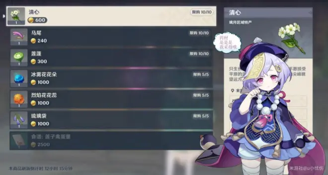 在药庐「不卜庐」我们可以买到一些药材,这些药材都是采药姑娘兼学徒的七七每天去山上采的。不要买了药就忘了七七哦~~