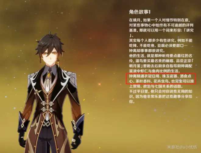 钟离为璃月人也是操碎了心,钟离精通衣冠日用、珠玉瓷器、酒食点心、茶叶香料、花卉虫鸟,也完全可以接上贸易、政治与七国关系的话题。