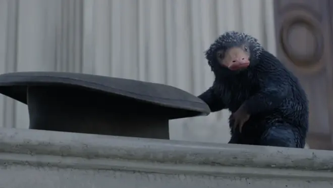 镜头转向几个小爪子,从纽特箱子的箱盖的箱体间的狭窄缝隙伸出来。