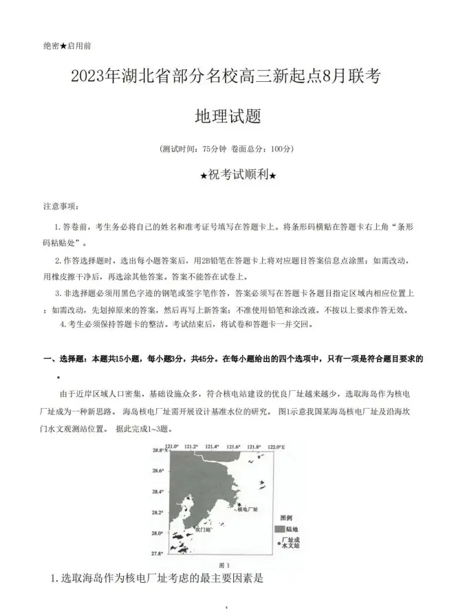 湖北省部分名校2024届高三年级新起点8月联考地理试卷及解析的评论 (共