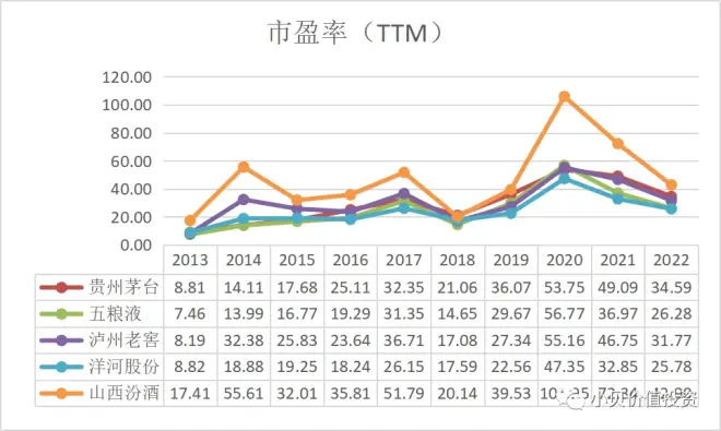由上图可以看到国内五家白酒企业近10年的市盈率情况。