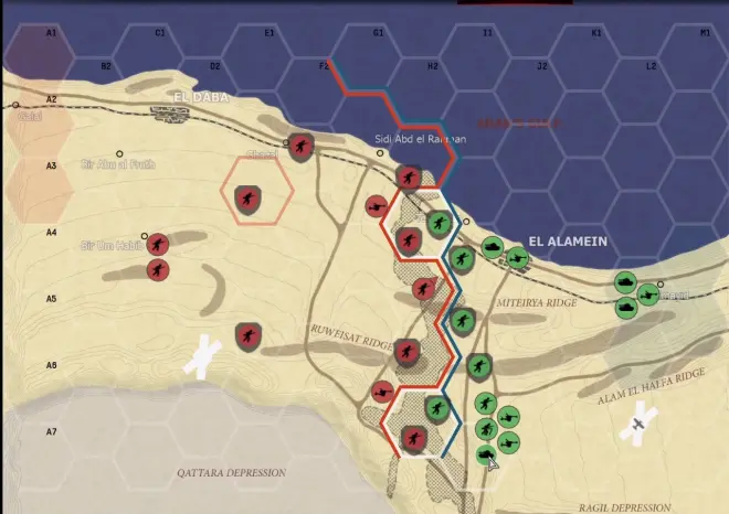 如图所示为初始两边的布置(英军视角)。可以看到,在开局时H4、H7是中立格,双方都不占据,E3则被德军占据,且初始就有一支步兵处于驻扎状态。加之E3离前线远而离德军出发点较近,这就表明,英军想要攻占E3格会花费大量的时间。在辛辛苦苦消灭了H4和H7的德军之后,英军的指挥发现德军增援开进E3,使得E3几乎不可能被拿下。然而不少德军指挥都会犯一个致命性错误,就是随随便便就把初始驻扎在E3的部队调走了,导致被英军摸掉了点。反过来,如果时刻维持部队在E3,就会导致英军的胜利目标1直接流产。