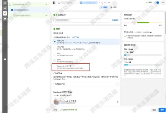7.到达广告组层级。选择Facebook公共主页