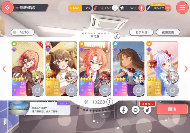在选歌界面选择完歌曲的难度后,会进入如下图所示的队伍配置界面: