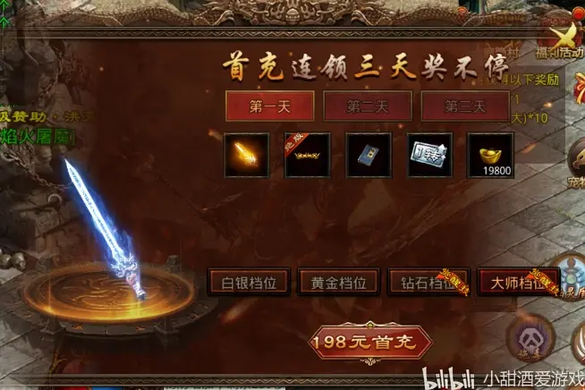 建议玩家进来充个198的首冲+30月卡+18精英训练剩下的冲元宝升赞助,升到4级赞助开启元宝回收和仓库功能(实充400),可以获得一个首冲武器(绝版),砍boos,还是小怪都非常的实用,还能领取里面的边纹和修为等提升你的纹路和境界,优先打四象材料,提升境界,打的卷轴也要存着,回收可以换取金币的。