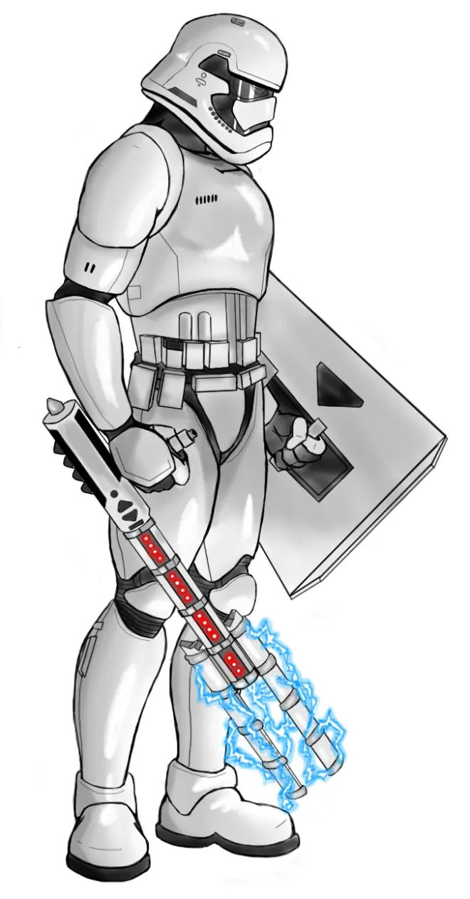 防暴冲锋队是第一秩序标准冲锋队的特殊变体。他们被指派在一序领土内维持世界秩序,他们接受了防暴战术训练,并获得了非致命装备,例如轻型复合betaplast弹道防暴盾牌和Z6 防暴警棍(可抵抗光剑)。他们还携带致命武器,例如Sonn-Blas F-11D 爆能步枪,以防局势失控。