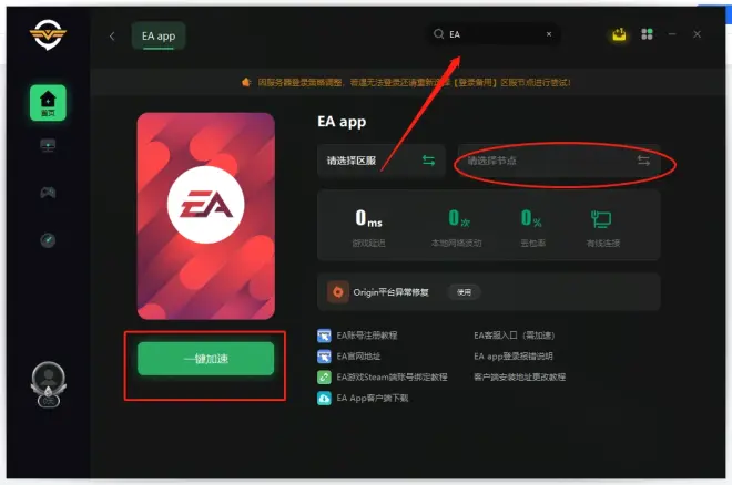 大家都知道EA服务器在海外,当大家网络不佳或者是其他因素也会碰到此问题,大家可以使用加速工具来解决,小编使用的是奇游加速工具,打开奇游搜索EA,选择加速节点,点击一键加速,完成加速后,大家就可以注册游戏账号了。