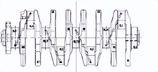 为减小曲轴质量及运动时所产生的离心力,曲轴轴颈往往作成中空的。在每个轴颈表面上都开有油孔,以便将机油引入或引出,用以润滑轴颈表面。为减少应力集中,主轴颈、曲柄销与曲柄臂的连接处都采用过渡圆弧连接。
