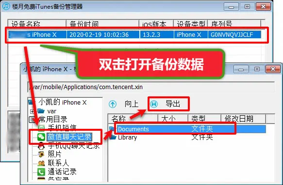 3. 备份结束后,需要使用第二个软件,软件名称:楼月免费iTunes备份管理器,用这个软件可以将微信聊天记录保存的Documents文件夹提取导出到电脑上。