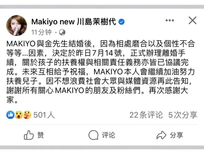 7月15日,台湾日籍女星,小S的好姐妹Makiyo突然在网络平台上宣布自己离婚的消息。文章中提到离婚的原因是自己和小金的性格不合适。要知道,Makiyo去年特意选择520的好日子结婚,现在两人的孩子都还不到一岁。