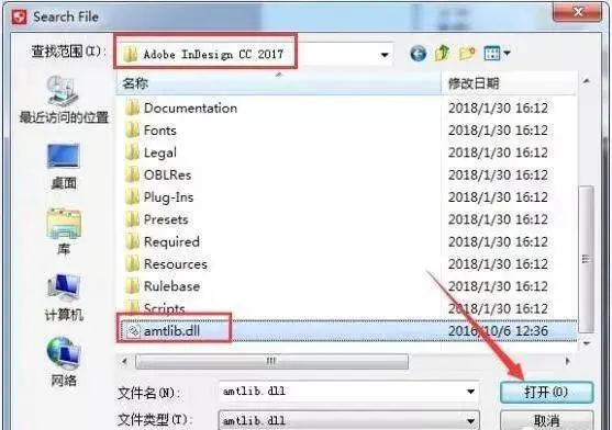9.在弹出的对话框中,选择打开C:\Program Files\Adobe\Adobe InDesign CC 2017,选择软件根目录下的amtlib.dll,点击打开