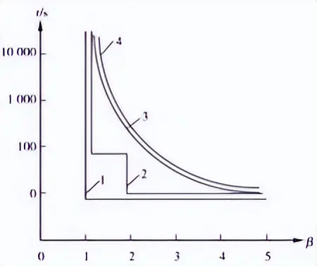 在这里,通常将电动机过载保护特性定义为:电动机的过载倍数与其过载保护动作时间之间的关系。如图3所示为电动机的过载保护特性曲线。