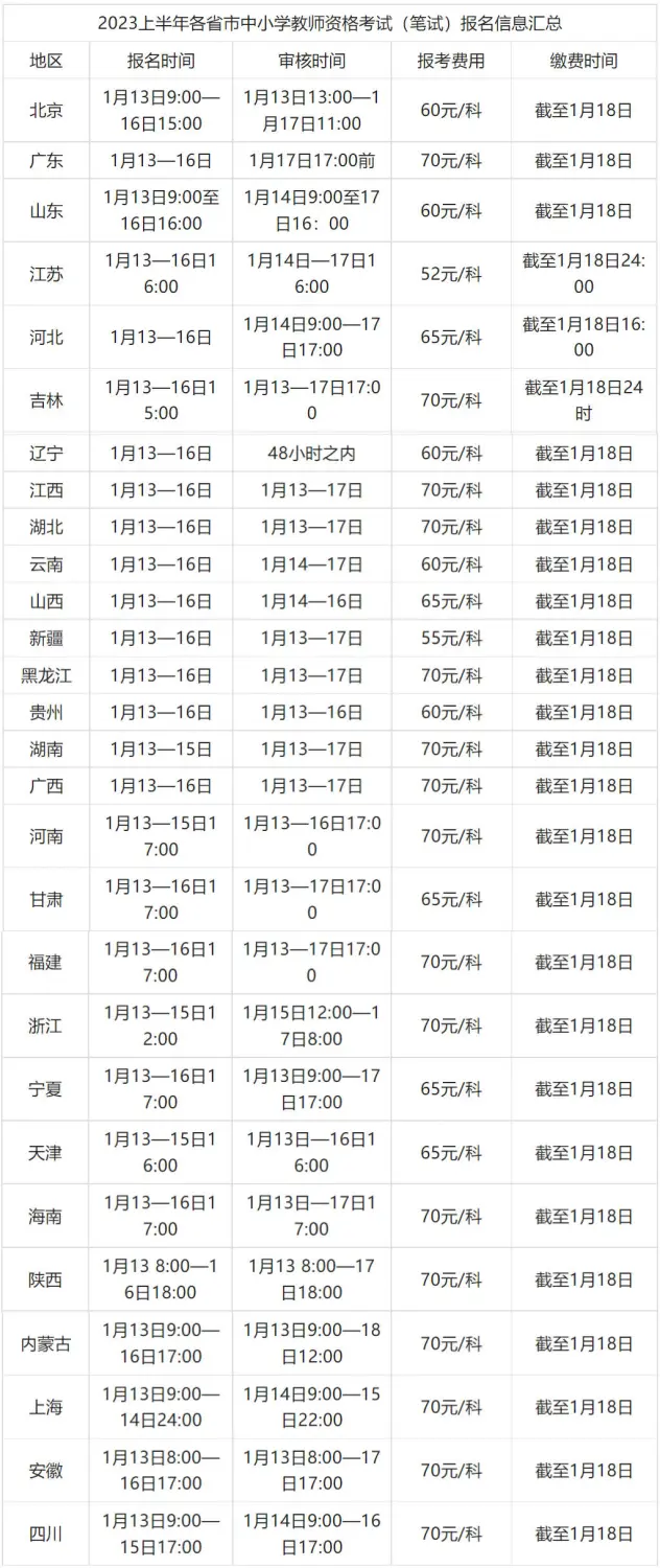 2023年上半年中小学教师资格考试(笔试)报名日期为2023年1月13日—16日(天津、浙江、河南、湖南、四川等地15日截止),报名网址为中国教育考试网(http://ntce.neea.edu.cn/)。