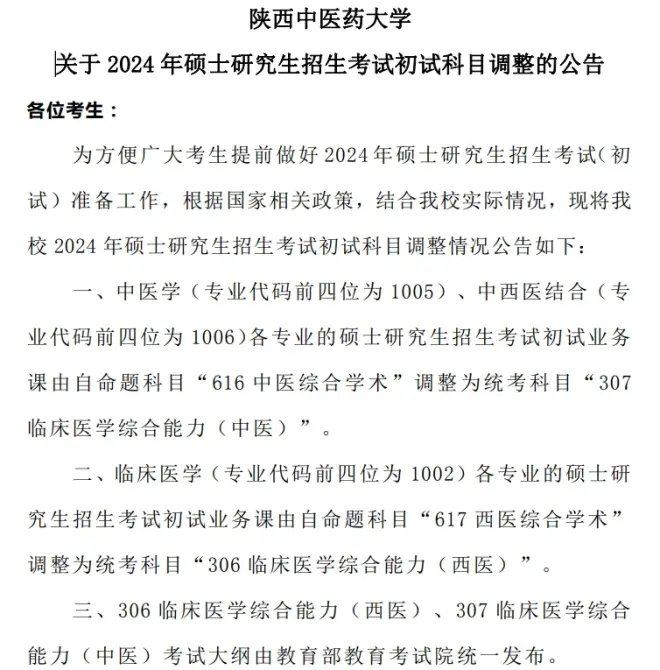 当天,陕西中医药大学研究生院发布了关于2024年硕士研究生招生考试科目调整的公告,相关医学类专业调整为全国统考科目。
