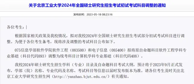 北京工业大学发布关于北京工业大学2024年全国硕士研究生招生考试初试考试科目调整的通知,075信息学部软件学院软件工程(083500)和电子信息(085400)拟将原自命题科目软件工程学科专业基础(科目代码893)调整为统考科目计算机学科专业基础(科目代码408)。