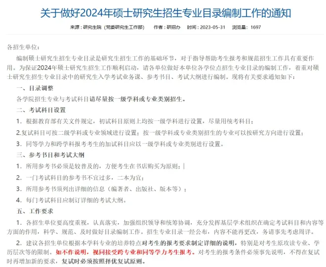 近日杭州师范大学研究生院发布关于做好2024年硕士研究生招生专业目录编制工作的通知,通知表示着重对硕士研究生招生专业目录中的研究生入学考试业务课、参考书目、考试大纲进行编制。