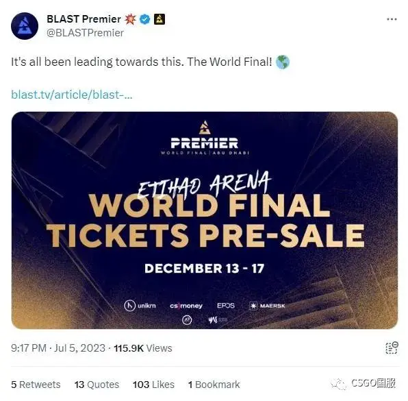 BLAST宣布将年终的世界总决赛继续落地阿联酋阿布扎比,并将于12月13日-17日在阿提哈德竞技场进行,这是2023年BLAST系列赛事的收官之战。去年G2在阿布扎比夺得冠军,打破了他们5年多以来的冠军荒。