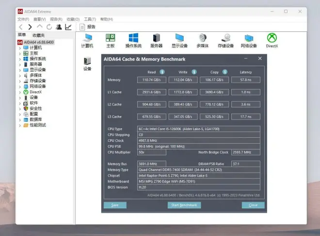 超频至7400MHz,这时内存条的时序为34-44-44-52,在AIDA64软件的测试中,读取速度为110.74GB/s,写入速度为112.04GB/s,延迟为57.8ns,延迟提升了不少。我手中的CPU体质比较差,无法超至8000MHz,甚至连7600MHz都不稳定。对DDR5内存条超频而言,除了内存条的颗粒要好之外,主板和CPU也要非常好才行。