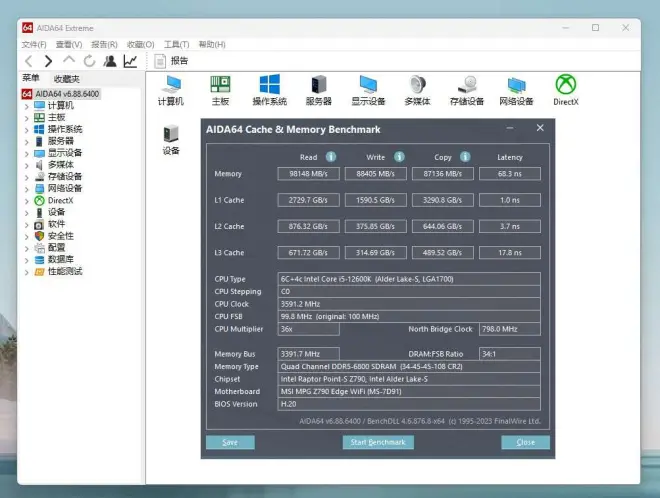 开启XMP模式6800MHz频率,这时内存条的时序为34-45-45-108,在AIDA64软件的测试中,读取速度为98148MB/s,写入速度为88405MB/s,延迟为68.3ns,性能与默频相比,提升了不少。