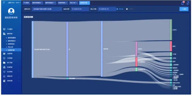 能源流向图展示单栋建筑指定时段内各类能源从源头到末端的的能源流向,支持按原始值和折标值查看。