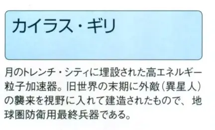 与宇宙世纪中赞斯卡尔帝国军的要塞炮同名的武器,但实际上二者完全不同。“凯拉斯基利”一词出自藏语“冈仁波齐向导”。轨道卫星炮凯拉斯基利始建于正历之前约700年前,也是月之民的祖先刚到月球的时候。它有着围绕月球赤道一周的巨大粒子加速器,其建造初衷是为了应对外敌(外星人)入侵而建造,被认为是可以保护整个月球甚至地球的巨大炮台,是地球圈防卫用的最终兵器。正历时代的月之民的运河,也是沿着这个修建粒子加速器时所挖的壕沟修建的。