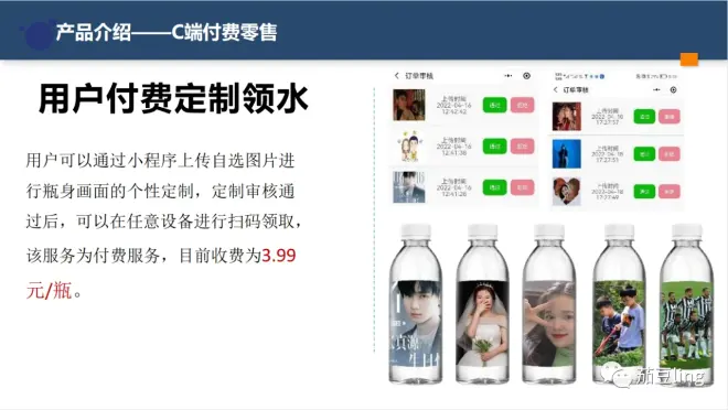 免费领水机除了可以领取免费饮用水之外,还可以上传图片,制作专属于我们自己的定制瓶身,个性定制属于自费服务,领取个性定制水时需要我们自己付费,目前收费是3.99元/瓶,上传我们自己想要打印在瓶身的图片,支付生成订单,订单审核通过之后,就可以在附近的设备扫码领取了!