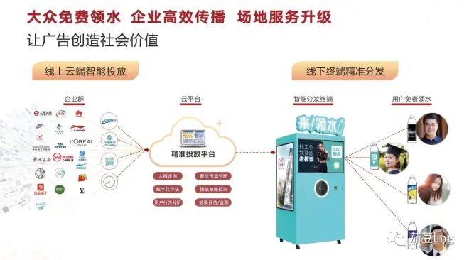 通过对于免费领水机项目的介绍,相信大家不难理解,免费领水的主要收益来源于企业广告主的广告投放,用户在免费领水的时候,会选择自己的性别年龄段,云端会根据用户所选择的信息匹配适合用户的广告信息,然后下发到手机端、机身屏幕、瓶身标贴,三端同时触达,用户在免费领水的同时,浏览了企业广告主的广告,同时会将印有广告主广告的饮用水带到其他场景传播,增加了广告的曝光率和传播率,这就是免费领水背后的商业逻辑:大众免费领水,企业付费精准传播,场地服务升级!
