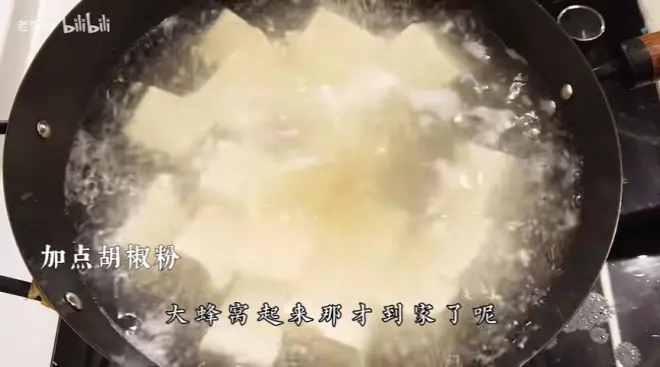 3、豆腐切块,凉水下锅煮,加盐调味,煮开后加入胡椒粉,把高压锅里面的汤滤出到锅里,把豆腐挑进去,大肠切段放入一起煮开。