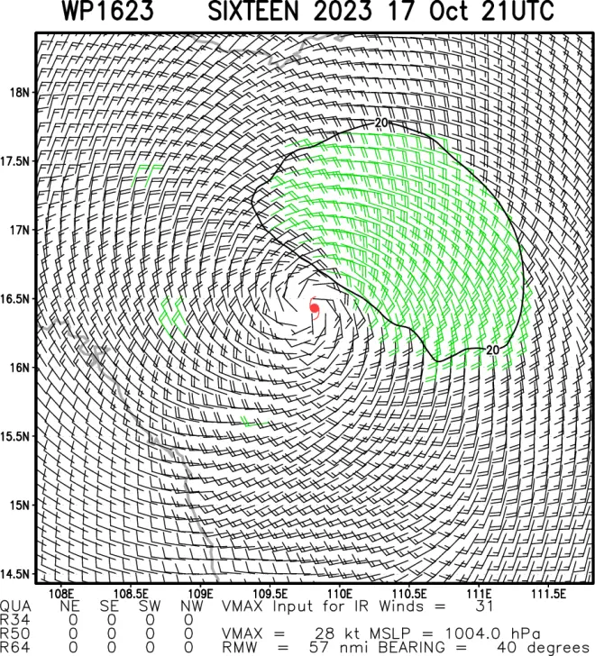 北京时间10月18日5时,热带低压16W的气旋中心位于越南南定省南定市东南方的南海海面上,也就是在东经109.80°,北纬16.40°上。目前风力25KTS(相当于6级风),风力维持不变。对流正在发展,云团不断卷入气旋中心。高空辐散+5~+10,其中西侧+15,高空辐散稍为增强;低空辐合-5~+5,其中西南侧+10,低空辐合稍为改善;风切变-5,16W未来所经之处的风切变条件较好;目前海水温度29.5°C(未来16W所经之处的海水温度大致保持在27.5~29.5°C),为气旋的增强创造条件;气旋中心正涡度持续增大。之前位于日本北海道稚内市东侧上空的冷低压已经东退、北抬,到达俄罗斯千岛群岛东侧的上空,强度不变;位于日本偏东方向的西太平洋副热带高压逐渐西伸、北抬。目前16W向西北偏北方向移动,移动速度为10公里/小时。未来16W将向偏北或西北偏北方向移动,风力逐渐增强。本专栏将持续关注16W的动向,敬请留意。
