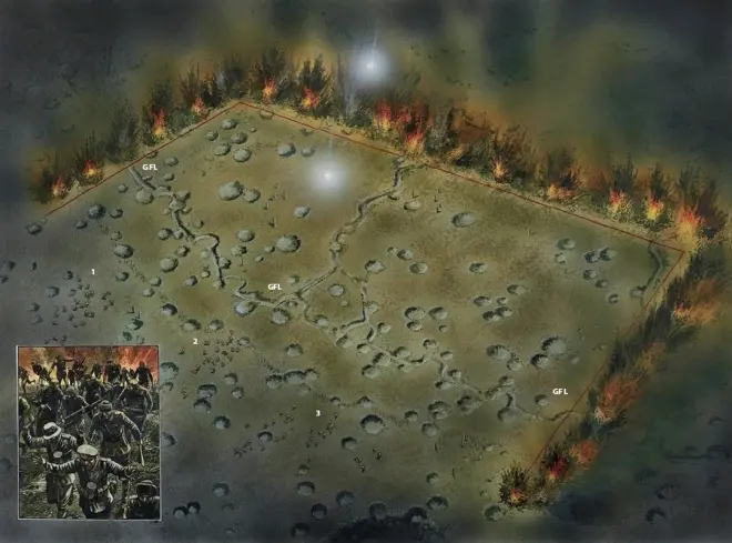 虽然和德国的“突击队”(Stosstruppen)的关系最为密切,但实际上参战各国都发展了自己有效的小单位“渗透战术”并将其用于突袭行动中。关键的区别在于德军将这些步兵战术作为标准的进攻方式有效地与炮兵和工兵等辅助兵种进行协调。本图虽只是简单地作代表性展示,但我们还是借鉴了1917年11月在洛林的Jakobsbrunnen奇袭中的一些特征,当时约200名德国步兵和工兵参加了那次考验了美军勇气的奇袭。