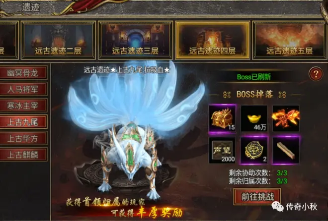 二、击败远古遗迹四层和五层后面3个boss会掉落不等数量的行会币。