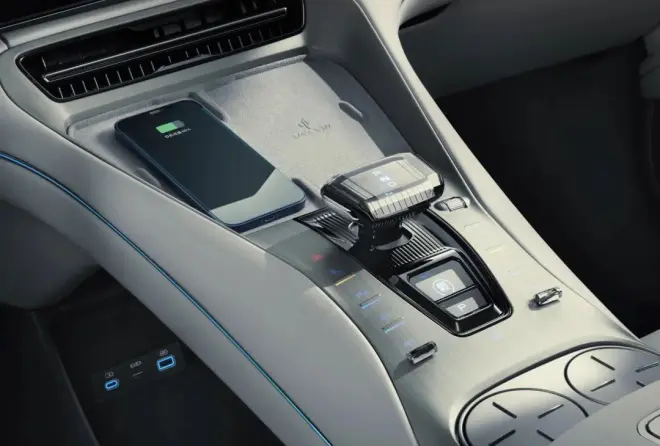 在前排中央岛台位置,腾势N7标配了两个50W功率的手机无线充电板,表面采用植绒材质,并且还有散热风道。对于如今高度依赖智能手机的用户来说,大功率快充确实是刚需配置。除此以外,前排还提供了一个USB-C、一个USB-A、一个120W点烟器电源。