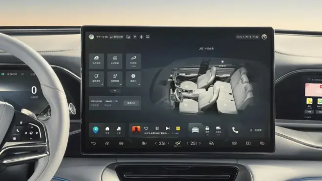 中控台上是一块17.3英寸的2.5K分辨率大屏,内置最新的腾势Link智能车机系统,并且支持5G互联网。不过,腾势N7并没有使用主流的高通8155车机芯片,而是采用了一枚6nm制程工艺的全新芯片。此前曾有传闻称,这枚芯片是由中国企业紫光展锐推出的A7870车规级产品,支持5G联网。