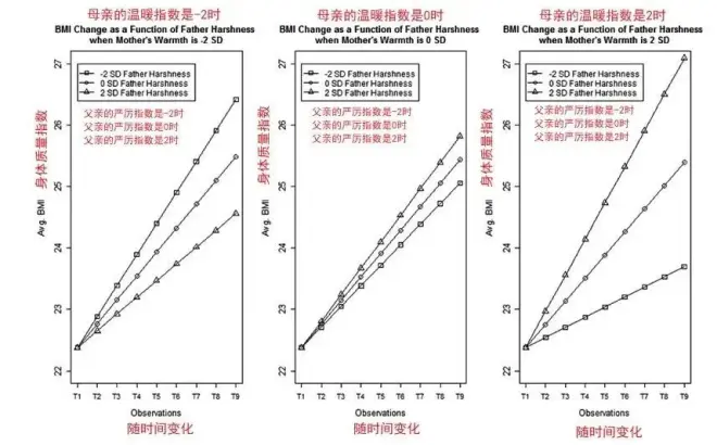 严厉的母亲也预示着青少年的体重指数BMI会随着时间的推移呈线性增长,而这种关联也同样被父亲的温暖所调节。
