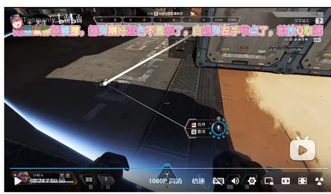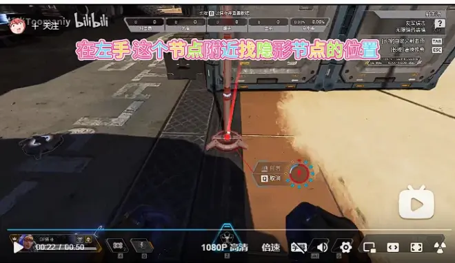 ④※※※※关键的第四步,从掩体前面拉q到掩体后面,面前是红色的电网,我们鼠标慢慢的往左手节点挪,到红色节点突然消失,并且白线连到了左手节点,这个时候准星的位置就是你隐形节点的位置。