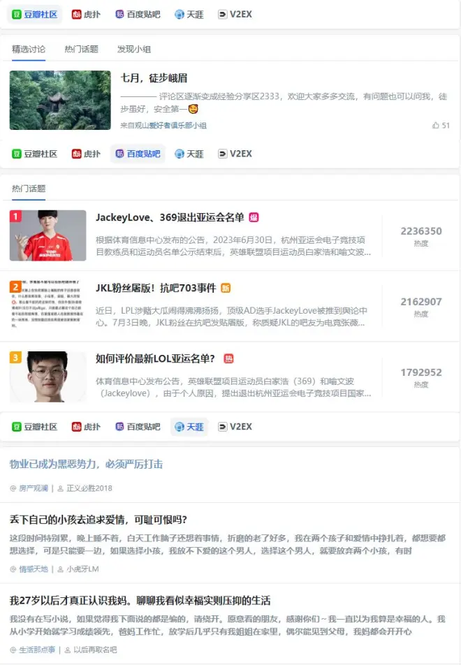 社区榜单收集5个网站,豆瓣社区分精选讨论、热门话题和发现小组,虎扑跟上面介绍的一样,百度贴吧是直接按热门话题排序,天涯是在左下角分了房产观澜、情感天地和生活那点事等等。