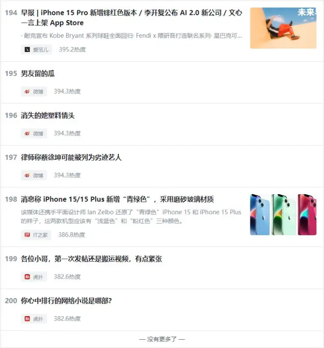 首页是全站的热度榜,一共三列分别是今日、本周和本月,默认是按照全网热度排序的,往下拉会逐页刷新,到底最多有200条。