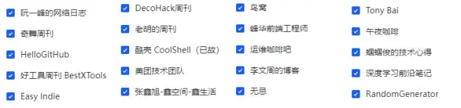 开发榜单收录4个网站,V2EX跟上面介绍的一样,技术期刊收录了20位知名博主有阮一峰、奇舞周刊、好工具周刊、老胡、美团、张鑫旭、鸟窝、峰华、无忌、午夜咖啡、蝈蝈俊等等。