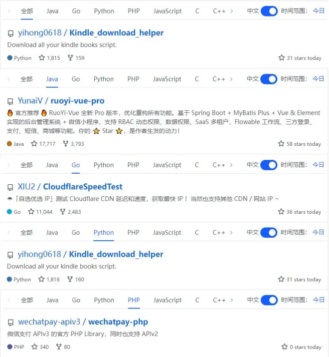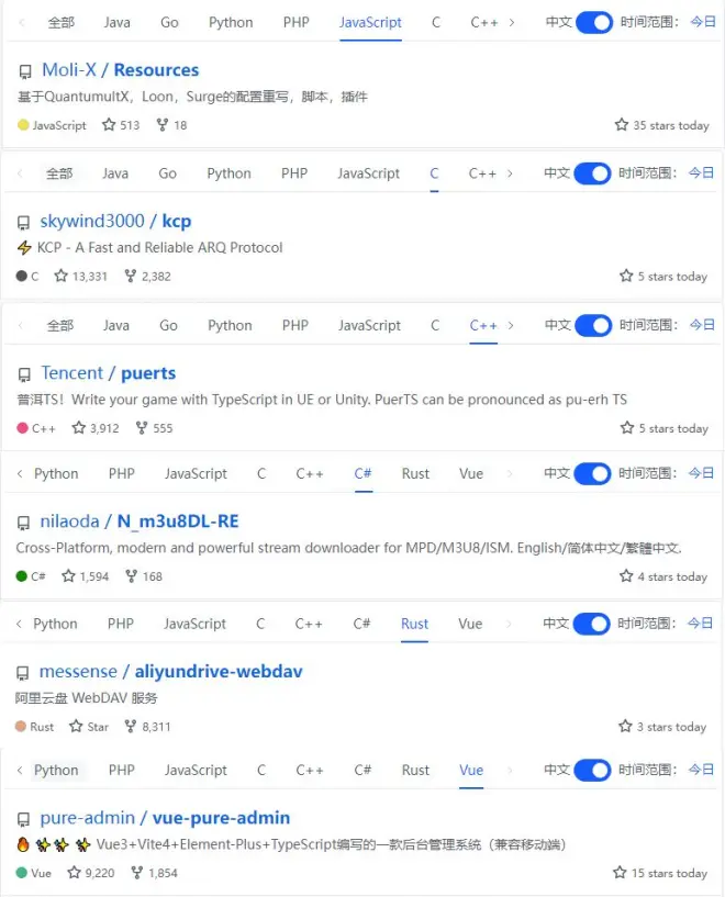 掘金网共9列分别是综合、后端、前端、Android、iOS、人工智能、开发工具、代码人生和阅读,G站很人性化可以勾选显示中文共11列分别是全部、Java、Go、Python、PHP、JavaScript、C、C++、C#、Rust、Vue。