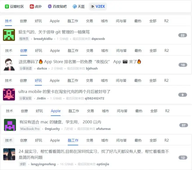 现在再着重介绍一下社区榜单里V2EX,共分11列分别是技术、创意、好玩、Apple、酷工作、交易、城市、问与答、最热、全部和R2。